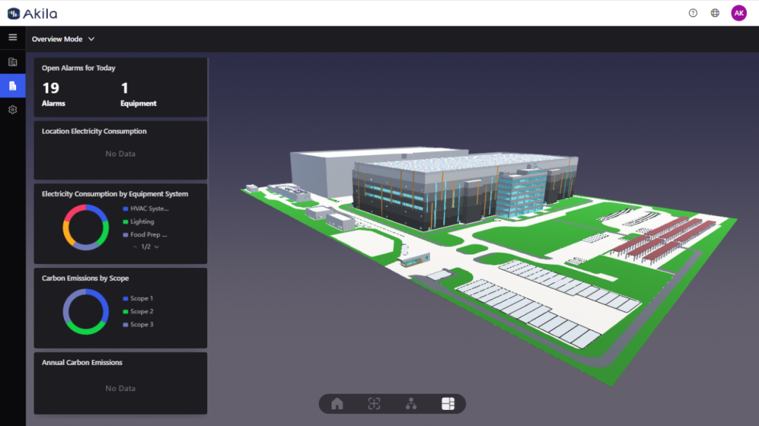 作为尖端的360° 全生命周期资产数据管理工具, Akila是基于云端的ESG 数字孪生平台,通过物联网和数字孪生技术实时进行数据收集、展现、分析,使碳管理中每一个环节的实时数据都可视化、可追溯。在绿色低碳的宏观政策环境下,Akila帮助企业管理者和资产组合拥有者进行ESG的解读和落地,更精准的抓取碳基线,使用数字化设施运维管理方法和自动化智能模拟工具来指导优化原有的碳管理方案。