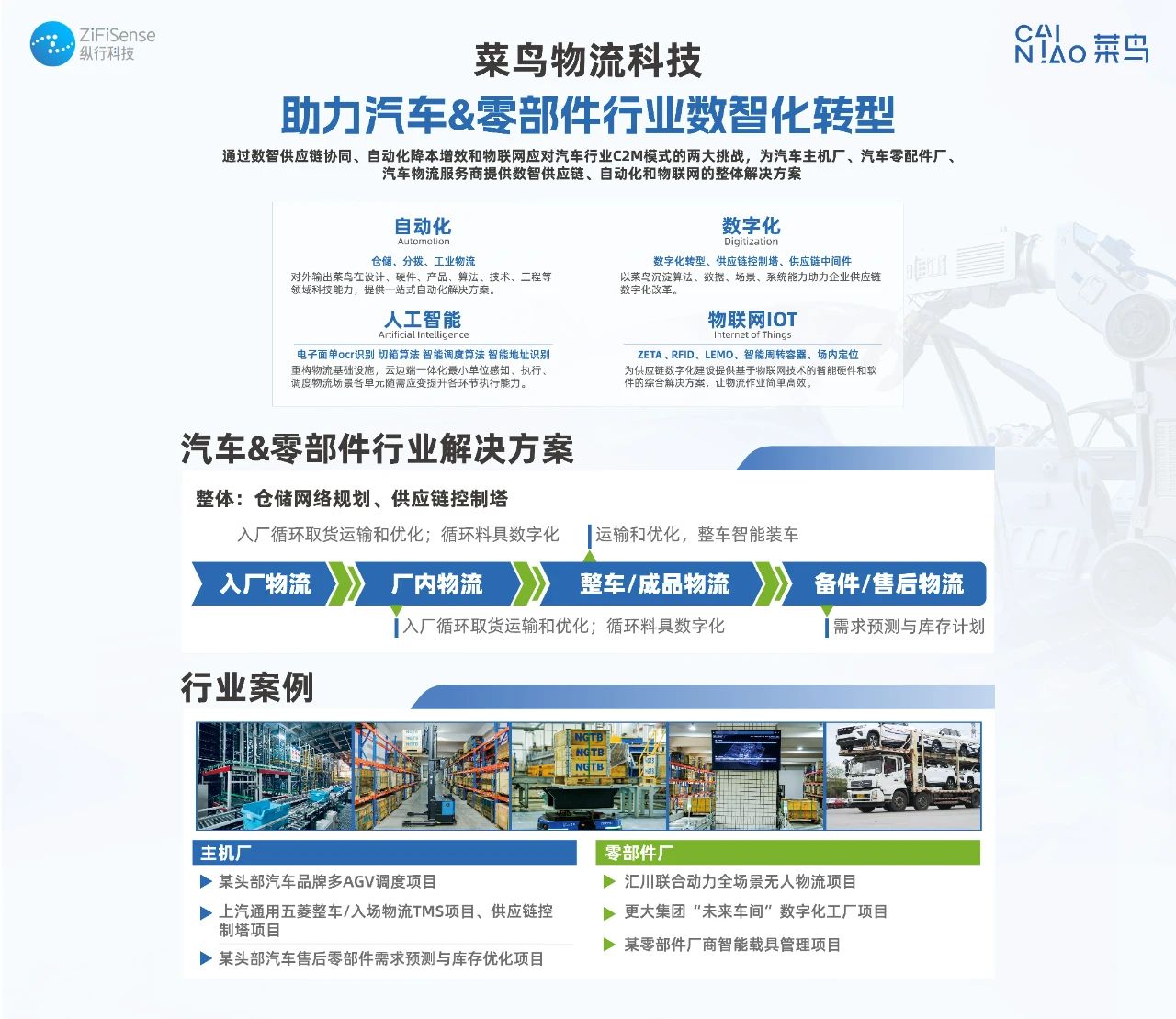 事实上,纵行科技与菜鸟的合作早已深入汽车及零部件行业全链路。针对汽车行业 C2M(用户直连制造)模式下的供应链协同难、成本控制难两大挑战,双方共同打造了 “自动化 + 数字化 + 物联网 + AI” 的一体化解决方案。此次会议中,双方进一步明确未来合作方向: